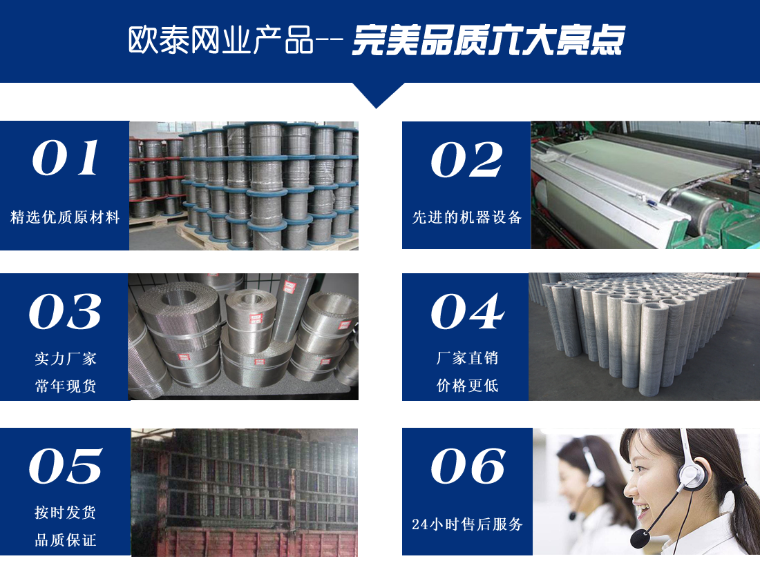 河北省安平縣歐泰五金網(wǎng)業(yè)有限公司座落于聞名全國的絲網(wǎng)之鄉(xiāng)河北省安平縣,是一家集科研,生產(chǎn), 經(jīng)營,銷售為一體的綜合性企業(yè)。我廠技術(shù)力量雄厚,采用優(yōu)質(zhì)原材料,嚴(yán)把質(zhì)量關(guān),主要絲網(wǎng)產(chǎn)品:編織系列:不銹鋼 絲網(wǎng),鐵絲網(wǎng),電鍍鋅鐵絲網(wǎng),熱鍍鋅鐵絲網(wǎng),包塑鐵絲網(wǎng),窗紗,,輸送網(wǎng),合股網(wǎng),勾花網(wǎng),六角網(wǎng),石籠網(wǎng),銀絲,銀網(wǎng)。護(hù) 欄網(wǎng):護(hù)攔網(wǎng)、公路護(hù)欄網(wǎng),鐵路護(hù)欄網(wǎng),機(jī)場(chǎng)護(hù)欄網(wǎng),工廠防護(hù)網(wǎng),小區(qū)防護(hù)網(wǎng),電焊網(wǎng),電焊網(wǎng)片,聚脂網(wǎng)系列:聚脂成型 網(wǎng)、聚脂單絲干網(wǎng)、印刷網(wǎng)。金屬板網(wǎng):鋼板網(wǎng)、鎳板網(wǎng),鋁板網(wǎng),沖孔網(wǎng)主要應(yīng)用于工業(yè),石油,化工,建筑,紡織,醫(yī) 藥,航天,航空,養(yǎng)殖,冶金機(jī)械等多個(gè)領(lǐng)域,我廠技術(shù)力量雄厚,設(shè)備先進(jìn),檢測(cè)方法齊全,產(chǎn)品質(zhì)量穩(wěn)定....